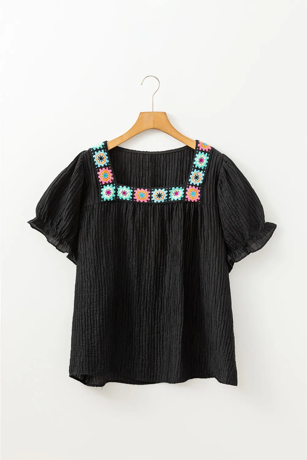 Be the first to review “Black Floral Crochet Square Neck Ruffled Short Sleeve Flowy Plus Size Top” Cancel reply