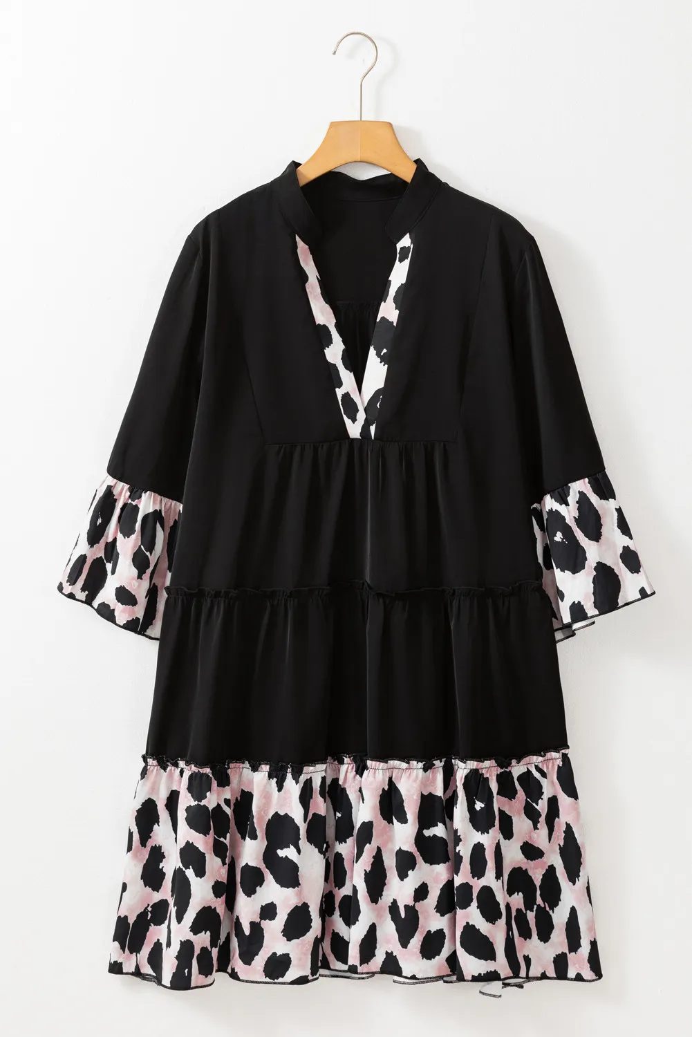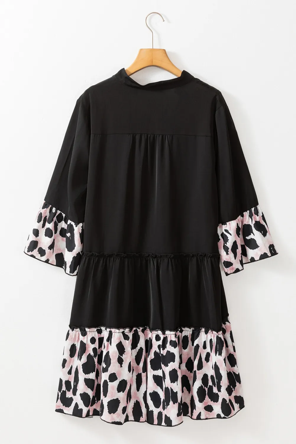 Black Leopard Patchwork Split Neck Ruffle Curvy Dress