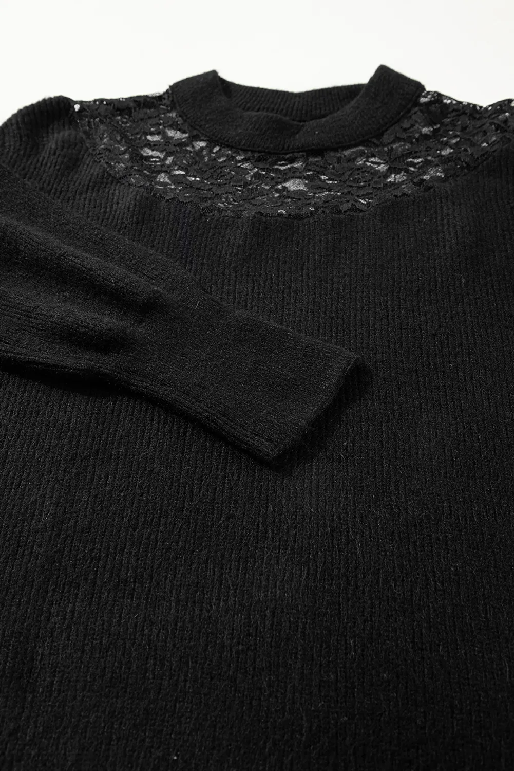 Black Plus Size Ribbed Knit Lace Splicing High Neck Sweater