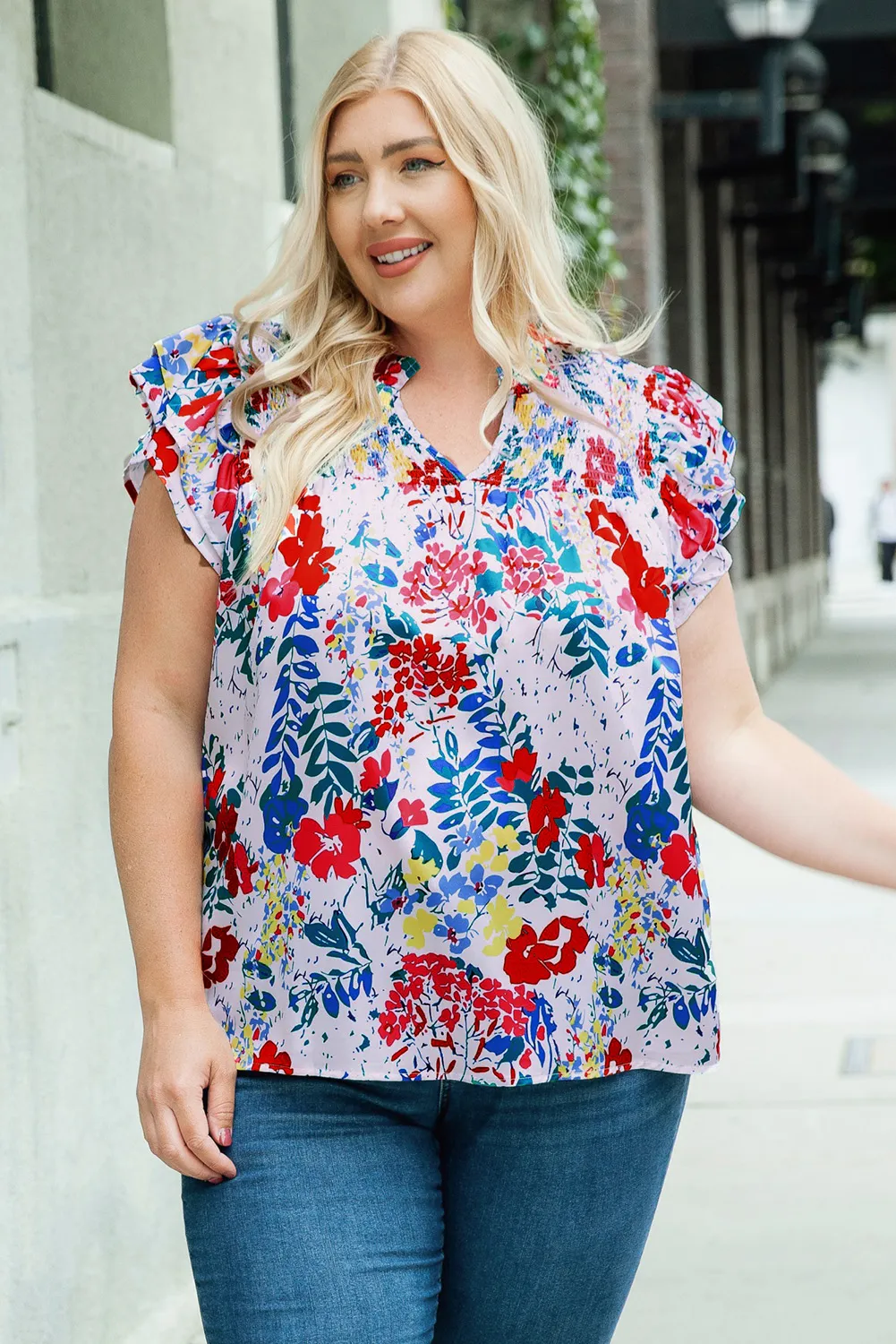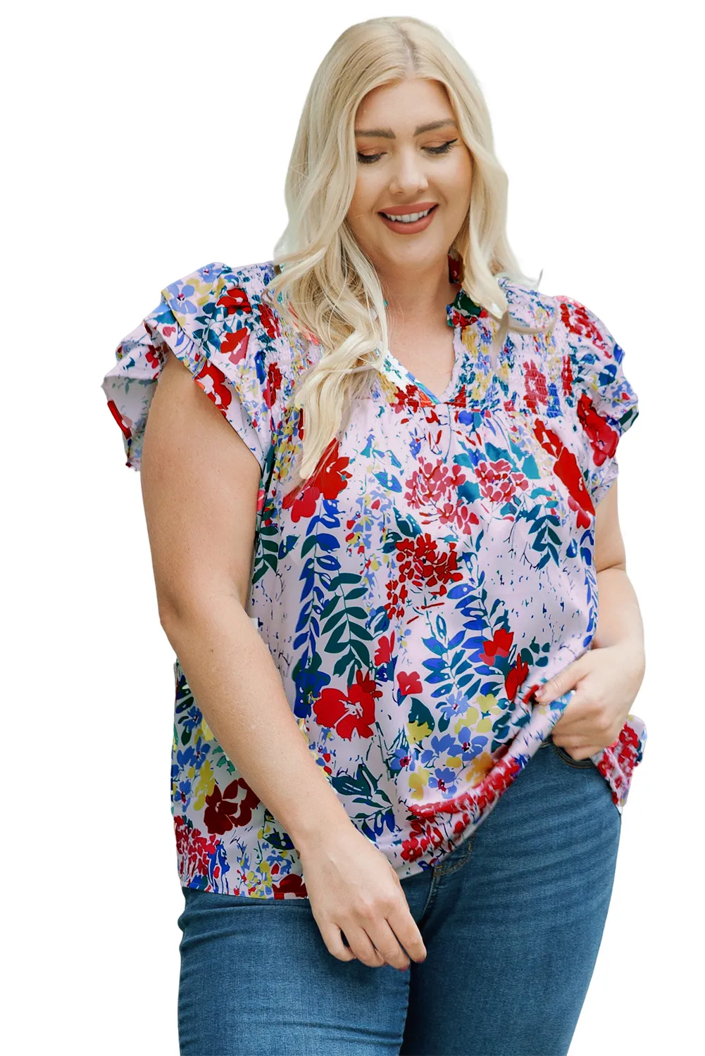 Home PLUS SIZE Plus Size Tops Fiery Red Plus Floral Print Ruffle Cap Sleeve V Neck Blouse
