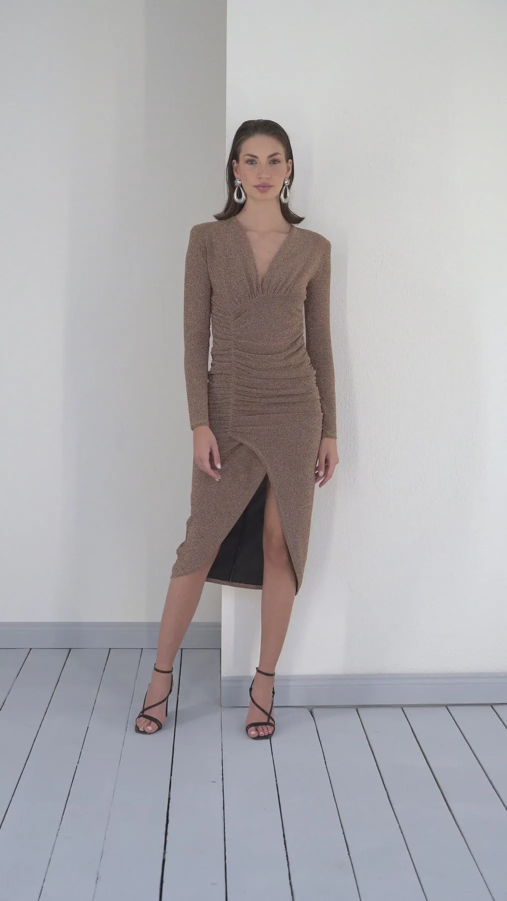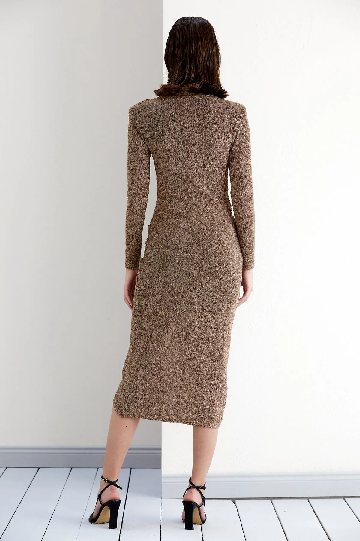 Mare Shimmer Long Sleeve Drape Midi Dress in Gold