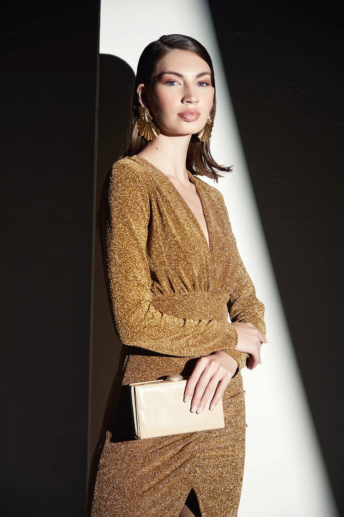 Stunning Shimmer Gold Midi Dress with Drape Rouge detailing at the front and slit.