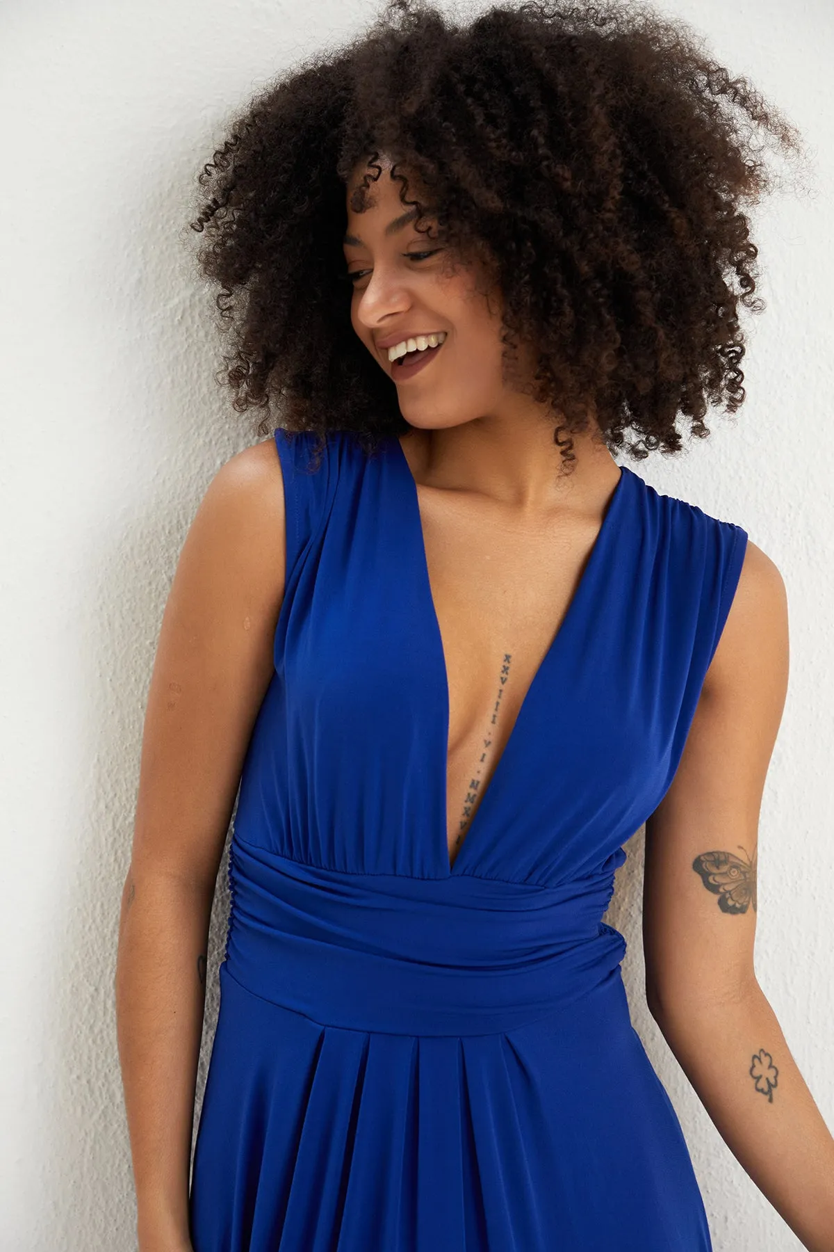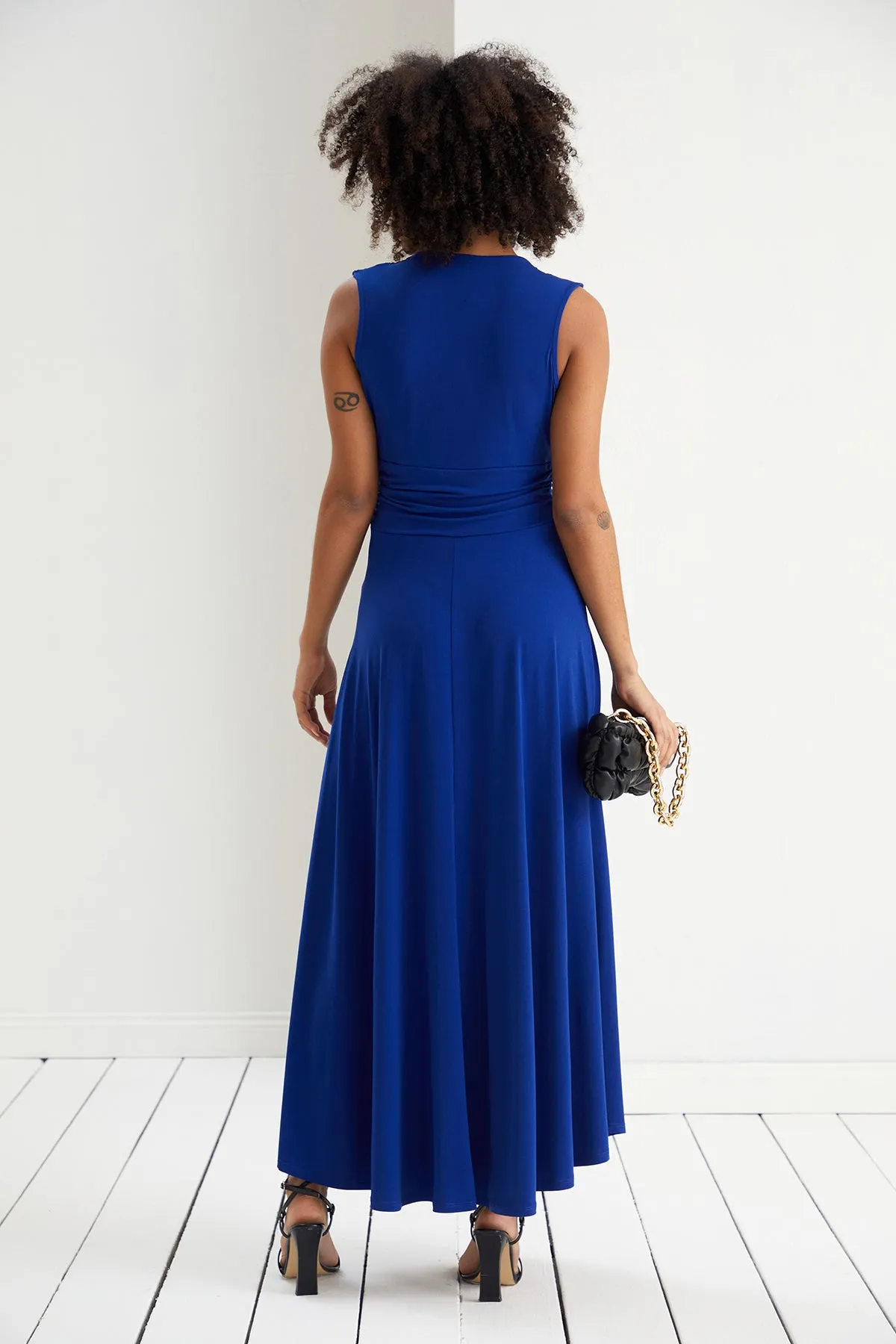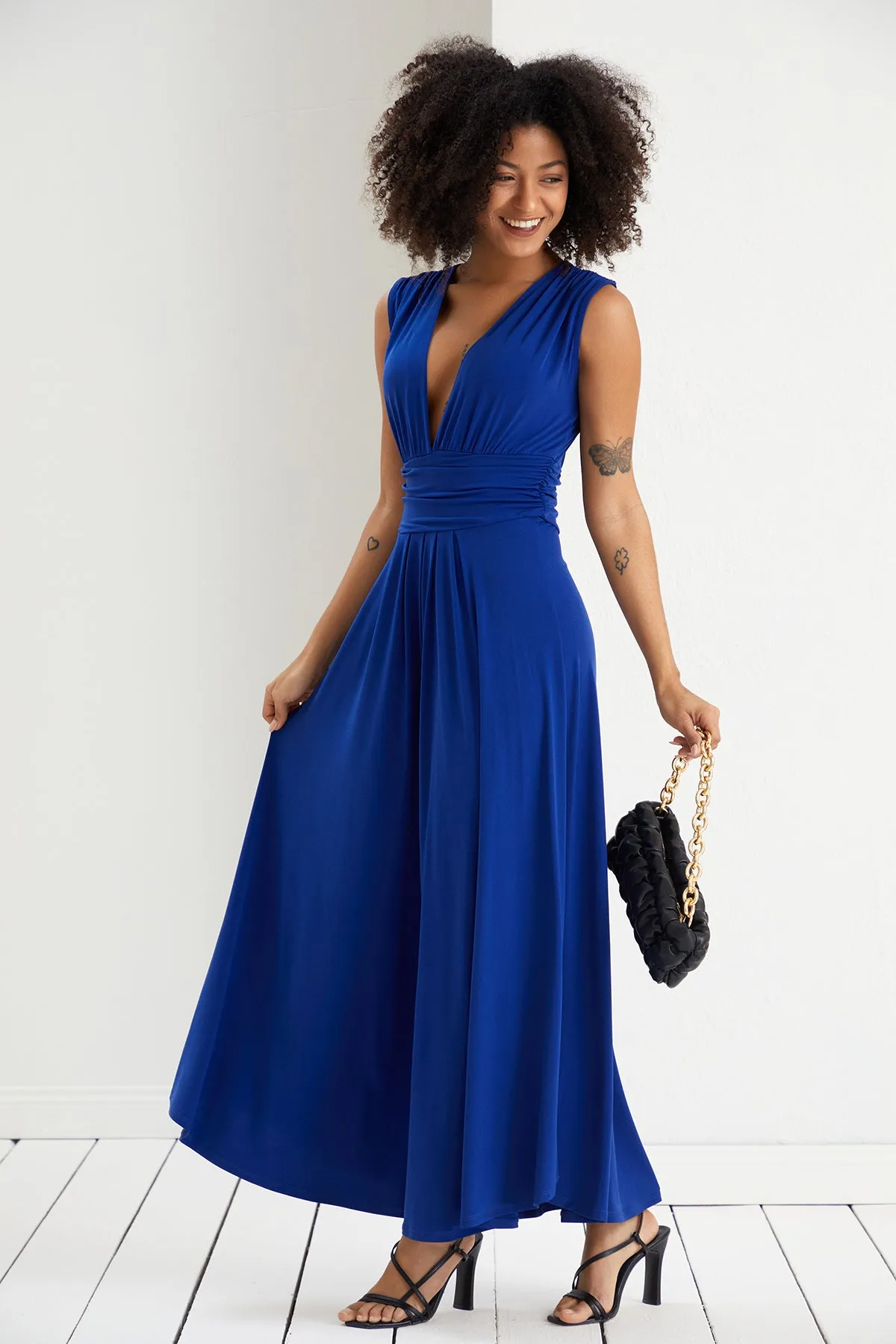 Sleeveless Maxi Dress with Deep V neckline in Royal Blue colour. Stunning Dress for your special occasion.
