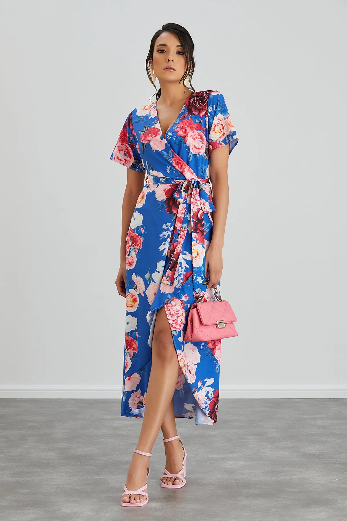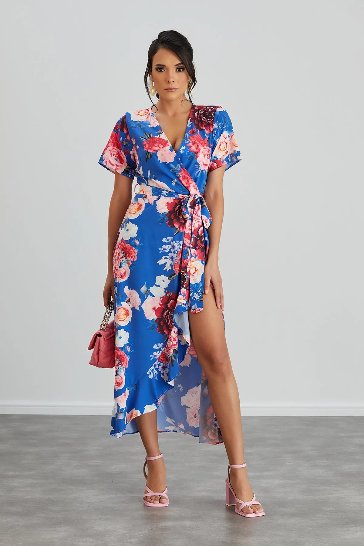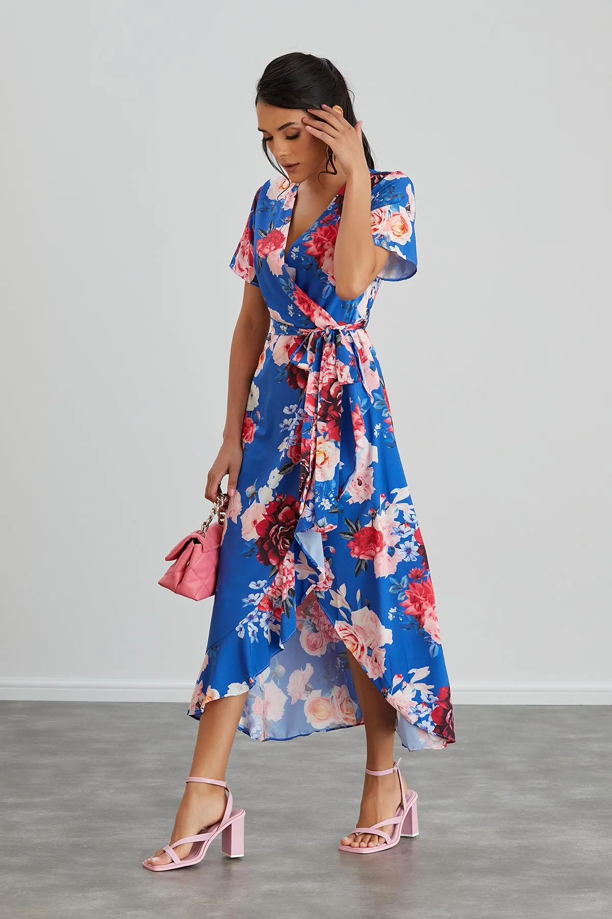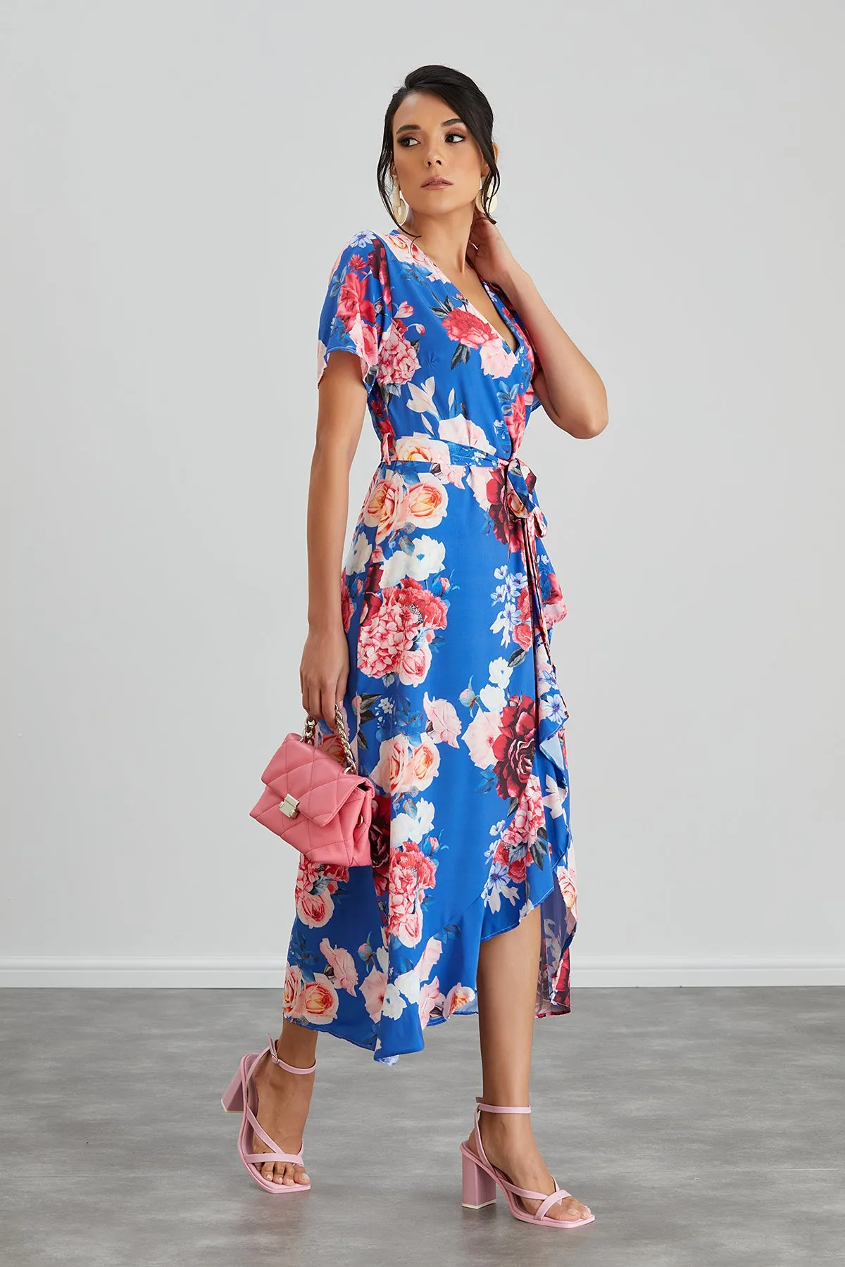 Wrap Midi Frill Skirt Dress in Sax Floral print
