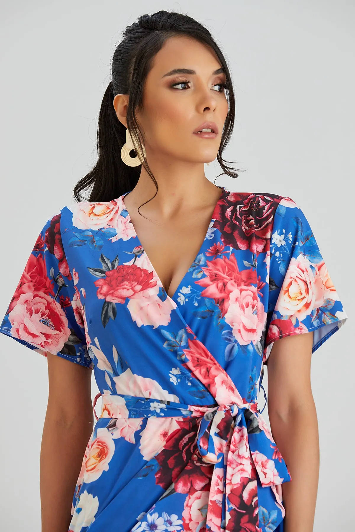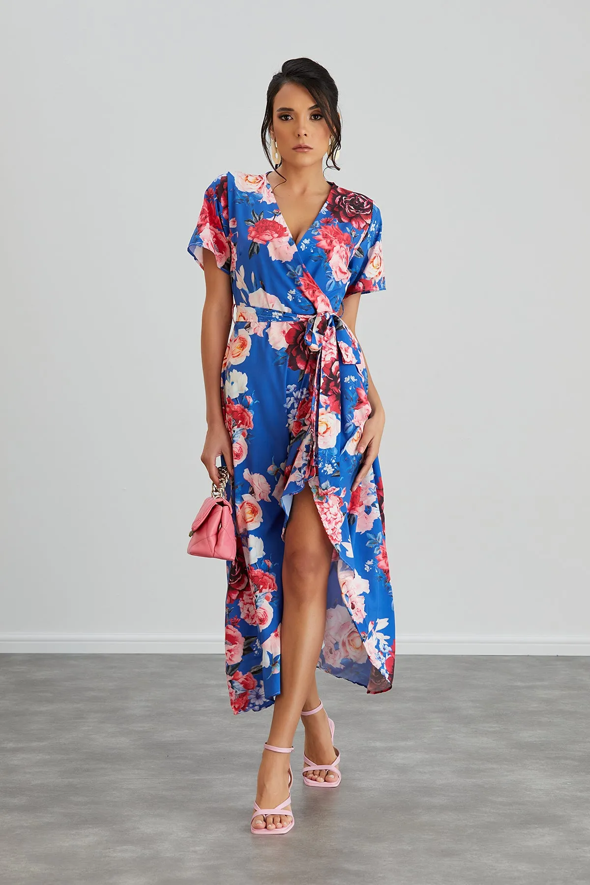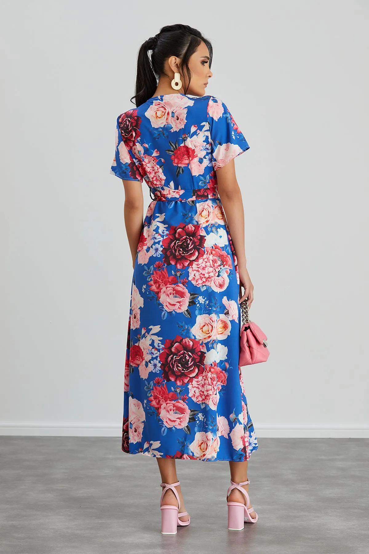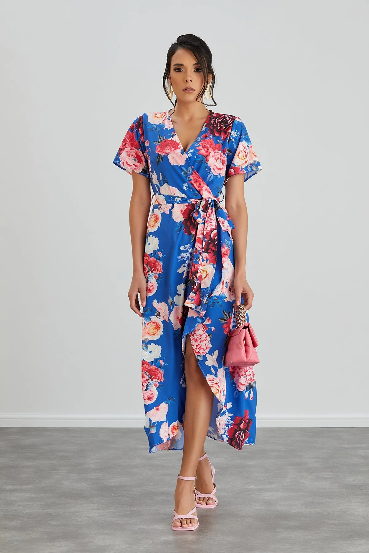 Wrap Midi Frill Skirt Dress in Sax Floral print